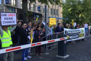 Ellerindeki Pankartlarla „doğrusunu yazılanlarla“, „Uber Şans vermeyin“ gibi, „Kanunsuzlar“ gibi, „Uber yasaktır gibi Sloganlarla öfkelerini gösteren Taksiciler Politikacilara Yolşu Taşımacılık Kanunda değişikliğe gitmemelerini simgeleyen bir Pankartda anlatıyor „Kanunları abartmayın“.