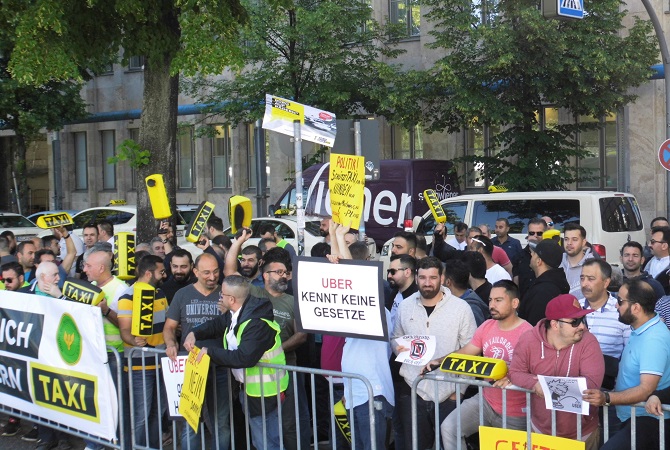Sie halten Plakate hoch, auf denen „die Wahrheit über Uber geschrieben steht“, wie es ein wütender Taxifahrer ausdrückt. „Gib Uber keine Chance“, „gesetzlos = RäUBER“, „Uber ist illegal“ oder „Uber- nein danke“. Ein deutliches Signal an die Politik, das PBefG nicht an die neuen Anbieter anzupassen, drückt das Plakat „UBERtreibt NICHT die Gesetze“ aus.