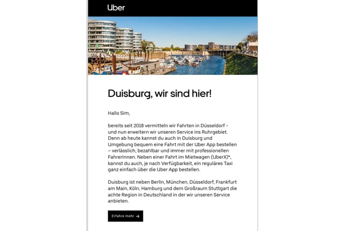 Mit den Worten „Duisburg, wir sind hier!“, kündigt Uber per E-Mail an seine registrierten Nutzer den Start in der insgesamt achten Stadt in Deutschland an. Somit setzt das US-Unternehmen trotz diverser juristischer Zurechtweisungen seinen Expansionskurs fort und platziert sich nach den Millionenstädten Berlin, München, Hamburg und Köln und den Großstädten Düsseldorf, Frankfurt am Main und dem Großraum Stuttgart nun auch erstmals in einer Stadt mit weniger als 600.000 Einwohnern.