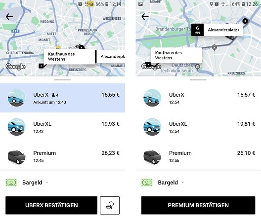 Auffällig an der Sache sind zwei Dinge: Zum einen werden die Uber-Kunden in der Online-Mitteilung nicht auf die preisliche Diskrepanz hingewiesen – immerhin ist der „Premium“-Dienst rund 60 Prozent teurer als die Fahrt für Normalsterbliche (UberX). Auch kann er, ähnlich wie bei allen Uber-Sparten, von Minute zu Minute ein anderer sein, wie zwei Probe-Screenshots von heute aus der Uber-App mit Anfragen für die gleiche Fahrt im Abstand von einer knappen Viertelstunde belegen.