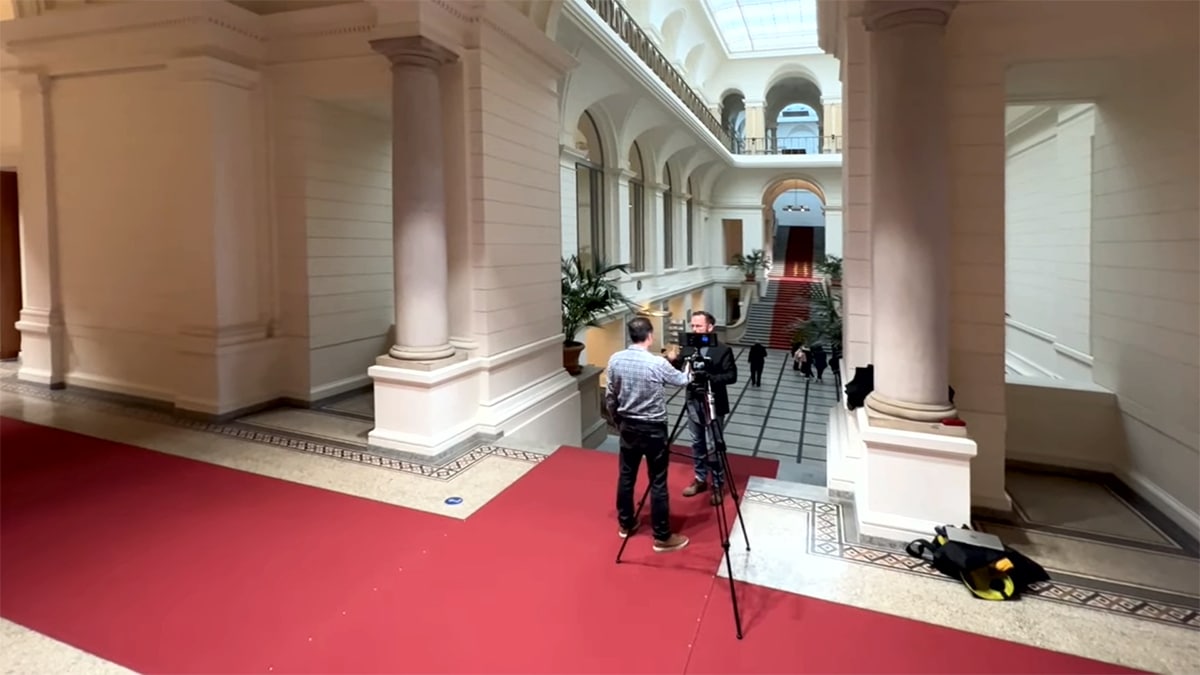 Simi und Kristian Ronneburg in der Halle des Abgeordnetenhauses von Berlin, dem einstigen Preußischen Landtag